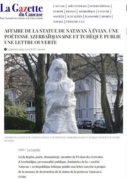 Fransanın https://www.lagazetteaz.fr xəbər portalında Praqada fəaliyyət göstərən “Natəvan” Azərbaycan Mədəniyyət Cəmiyyətinin sədri, tanınmış şairə Leyla Begimin görkəmli Azərbaycan şairəsi Xurşidbanu Natəvanın Evian-lö Bən şəhərindəki heykəli ilə bağlı Fransa ictimaiyyətinə ünvanlanmış açıq məktubu yayımlanıb.