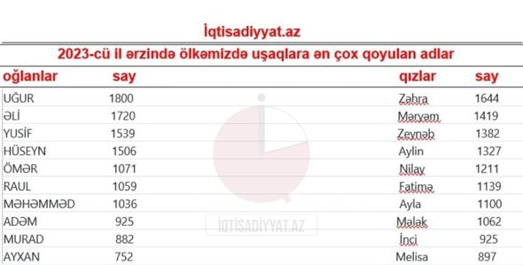 Ötən ilin populyar uşaq adları – SİYAHI Cəmiyyət 01 Yanvar 2024 TURAL KƏLBƏCƏRLİLeave a Comment on Ötən ilin populyar uşaq adları – SİYAHI Ötən il Azərbaycanda uşaqlara ən çox qoyulan adlar məlum olub. İqtisadiyyat.az ən çox qoyulan adların statistikasını əldə edib. Ötən il üzrə oğlan və qız uşaqlarına ən çox qoyulan adların ilk onluğunu təqdim edirik: www.102info.az Baxış Sayı: 241
