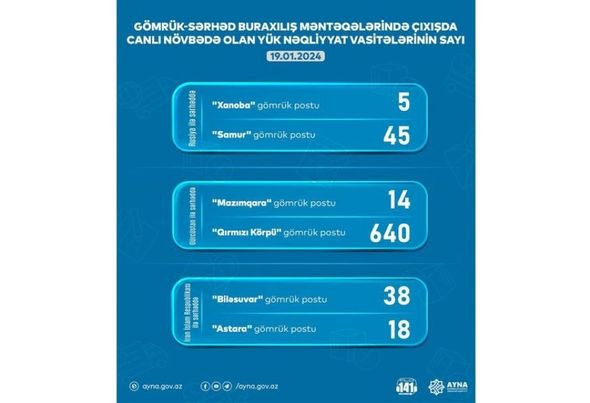Bildirilir ki, “Biləsuvar” gömrük postunda 38, Astara gömrük postunda 18, “Mazımqara” gömrük postunda 14, “Samur” gömrük postunda 45 və “Xanoba” gömrük postunda beş yük maşını var.