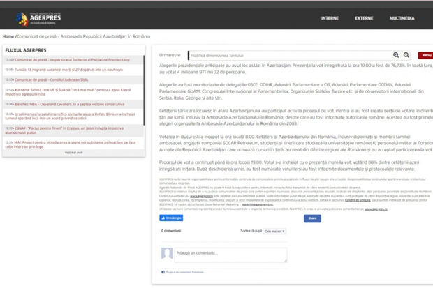 Bununla yanaşı, Rumıniyanın “rador.ro” xəbər saytında “Azərbaycanda keçirilən prezident seçkisində İlham Əliyev liderdir” başlıqlı neytral mövqeli məlumat yerləşdirilib. ABŞ-nin “Oracle Advisory Group” təşkilatının keçirdiyi “exit-poll”a istinad edilərək yazılan xəbərdə Azərbaycanda keçirilən növbədənkənar prezident seçkisində İlham Əliyevin 93,9 faiz səslə qalib gəldiyi bildirilir.