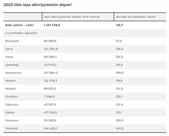 Məlumata görə, ötən il Səbaildə iaşə dövriyyəsinin illik dəyəri 471 milyon 919 min manat təşkil edib. Bu, 2022-ci ilin göstəricisi ilə müqayisədə 12,1% çoxdur.