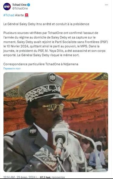 Çadın keçid dövrü prezidenti fransapərəst Mahamat İdriss Debi İtno həbs olunub, onun əsas rəqibi – Sərhədsiz Sosialist Partiyası (SSP) lideri Yəhya Diallo isə öldürülüb.