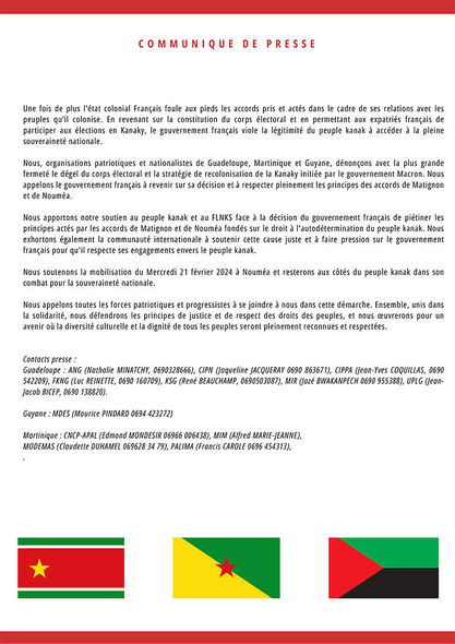 Bakı Təşəbbüs Qrupu ilə əməkdaşlıq edən Qvadelupa, Fransız Qvianası, Martinik və Fransız Polineziyasının siyasi hərəkat və partiyaları BTQ-nin təşəbbüsü ilə Yeni Kaledoniyada bu gün keçirilmiş etiraz aksiyası ilə əlaqədar dəstəkverici bəyanatla çıxış ediblər.