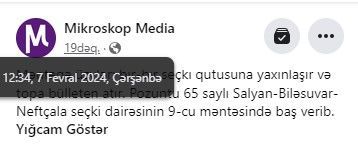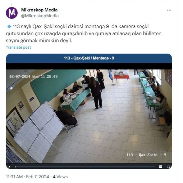 P.S. “Mikroskopmedia” bu paylaşımdan öncə saat 11:31-də 113 saylı Qax-Şəki seçki dairəsinin 9-cu məntəqəsindəki seçki qutularının uzaqda olduğunu və oluna biləcək saxtakarlığın müşahidə edilməsinin mümkünsüzlüyü ilə bağlı paylaşım etmişdi. Əgər dövlətin seçkilərdə saxtakarlıq etmək niyyəti olsaydı, 65 saylı Salyan-Biləsuvar-Neftçala seçki dairəsinin 9-cu məntəqəsindəki qutuları da kameralardan uzaq məsafəyə yerləşdirərdi.
