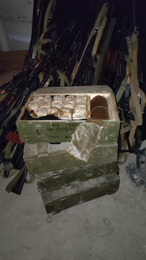 Polis əməkdaşlarının keçirdikləri tədbirlərlə Xankəndi şəhərində yerləşən uşaq bağçasının zirzəmisindən 1 ədəd dron, 1 ədəd dron üçün tripot, 29 ədəd müxtəlif markalı avtomat silahı, 4 tapança, 27 tüfəng, 416 ədəd qumbara, 113 alışdırıcı, 113 ədəd partlayıcı, 1178 patron darağı, 8508 ədəd mərmi, 24320 ədəd müxtəlif çaplı patron, 30 ədəd kapsul, 3 ədəd optik nişangah, 10 gecəgörmə cihazı, 50 ədəd rabitə qurğusu, 34 süngü-bıçaq, 57 ədəd əleyhqaz, 4 binokl, 4 penal dəsti və digər sursatlar aşkar olunaraq götürülüb.