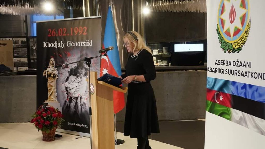 Estoniya-Azərbaycan parlamentlərarası dostluq qrupunun sədri xanım Riina Solman Xocalıda törədilmiş bu qətliamı insanlığa qarşı qanlı cinayət kimi qiymətləndirib, Xocalı soyqırımının 32-ci ildönümü ilə bağlı dostluq qrupu tərəfindən qəbul edilən bəyanatın vacibliyini və önəmini vurğulayaraq bəyanatın mətnini oxudu.