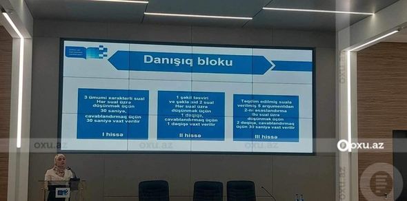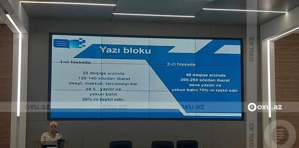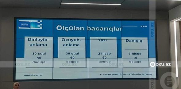 O bildirib ki, imtahanda hər bacarıq üzrə müvafiq vaxt ayrılacaq: dinləyib-anlama üçün 30 suala 45 dəqiqə, oxuyub anlama bacarığı üçün 39 suala 60 dəqiqə ərzində cavab vermək lazım olacaq. Yazı bacarığı üzrə 2 hissəni cavablandırmaq üçün 60 dəqiqə, danışıq üzrə 3 hissəni cavablandırmaq üçün 15 dəqiqə veriləcək”.
