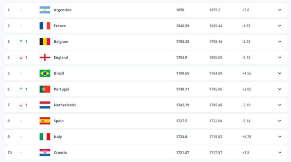 Siyahıya yenə Argentina (1 855,2) başçılıq edir. Fransa (1 845,44) ikinci, Belçika (1 798,46) üçüncü yerdədir.