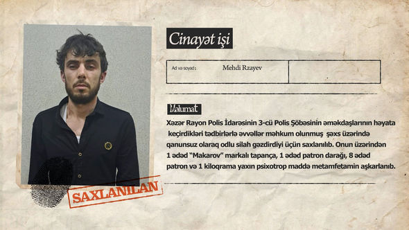 Bildirilib ki, Xəzər Rayon Polis İdarəsinin 3-cü Polis Şöbəsinin əməkdaşlarının həyata keçirdikləri tədbirlərlə əvvəllər məhkum olunmuş 1994-cü il təvəllüdlü Mehdi Rzayev üzərində qanunsuz olaraq odlu silah gəzdirdiyi üçün saxlanılıb. Onun üzərindən bir ədəd “Makarov” markalı tapança, bir ədəd patron darağı, səkkiz ədəd patron və bir kiloqrama yaxın psixotrop maddə metamfetamin aşkarlanıb.