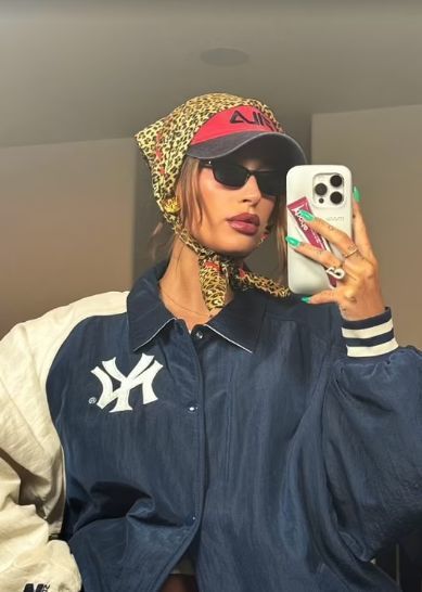 27 yaşlı Heyli Biber qeyri-adi şəkildə ictimaiyyət qarşısına çıxıb. İş qadını ağ-göy rəngli pencək, qara enli şalvar, ağ köynək, boz idman ayaqqabısı geyinib və başına qırmızı papaq qoyaraq üstündən bəbir təsvirli yaylıq geyinib. Model saçlarını at quyruğu formasında yığıb və yüngül makiyaj edib.