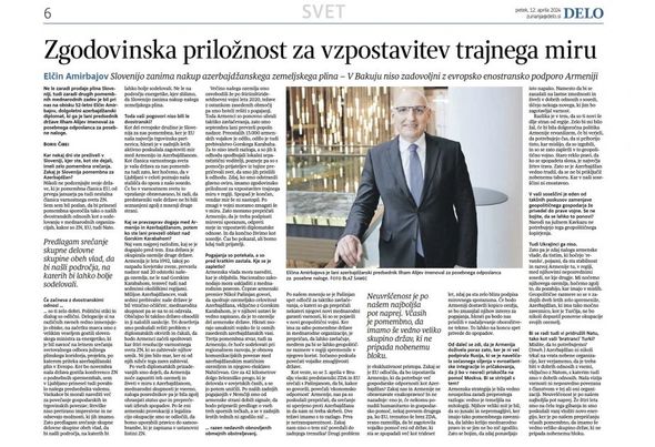 Sloveniyanın “Delo” gündəlik qəzetində “Dayanıqlı sülhün bərqərar olması üçün tarixi fürsət” başlıqlı məqalə dərc olunub.