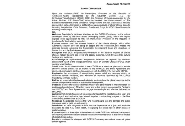 Kommünikedə COP29 Sədrliyi çərçivəsində inkişaf etməkdə olan kiçik ada dövlətlərinin üzləşdiyi problemlərə göstərilən diqqətə görə Prezident İlham Əliyevə təşəkkür bildirilir, COP29-un inklüziv, şəffaf və neytral platforma olacağına əminlik ifadə edilir.