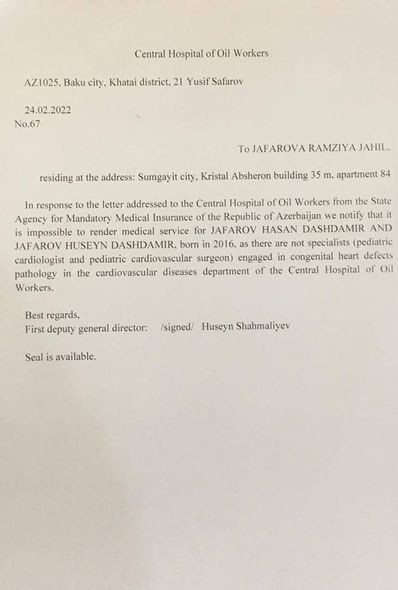 “Həsən və Hüseyn əkiz övladlarımdır. Onlar anadangəlmə ürək xəstəliyindən əziyyət çəkirlər. İnanın ki, doğulduqları gündən müalicədəyik. Hazırda onların əməliyyata ehtiyacları var. Əməliyyat isə Almaniya və ya İsraildə həyata keçirilə bilər. Bu əməliyyatı qarşılamaq üçün bizim 60-70 min manata ehtiyacımız var”.