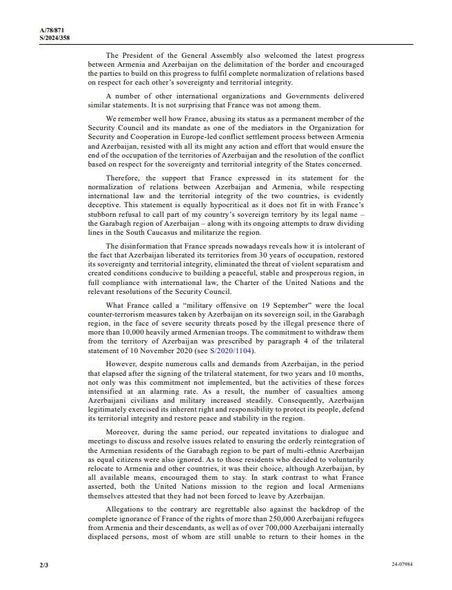 Məktubda qeyd olunub ki, Fransa nümayəndəyə heyəti BMT Təhlükəsizlik Şurasının 19 aprel 2024-cü il tarixli iclasında Azərbaycan və Ermənistan arasındakı münasibətlərlə bağlı əsassız və yanlış fikirlər səsləndirib.