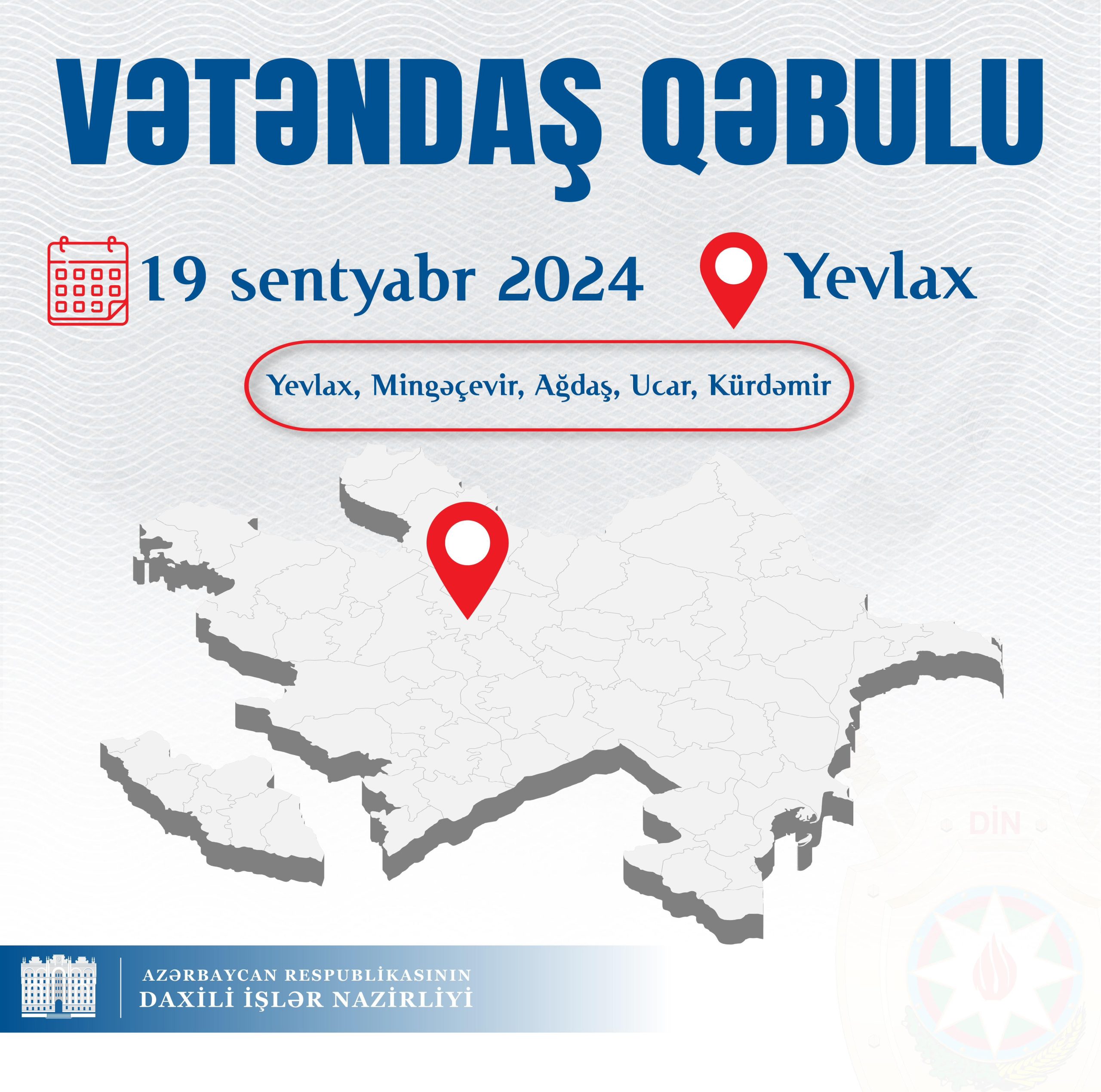 Azərbaycan Respublikasının daxili işlər naziri general-polkovnik Vilayət Eyvazov tərəfindən 2024-cü il sentyabr ayının 19-da Yevlax Rayon Polis Şöbəsinin inzibati binasında Yevlax, Kürdəmir, Ağdaş, Ucar və Mingəçevir şəhər və rayonlarının sakinlərinin qəbulu keçiriləcək.
