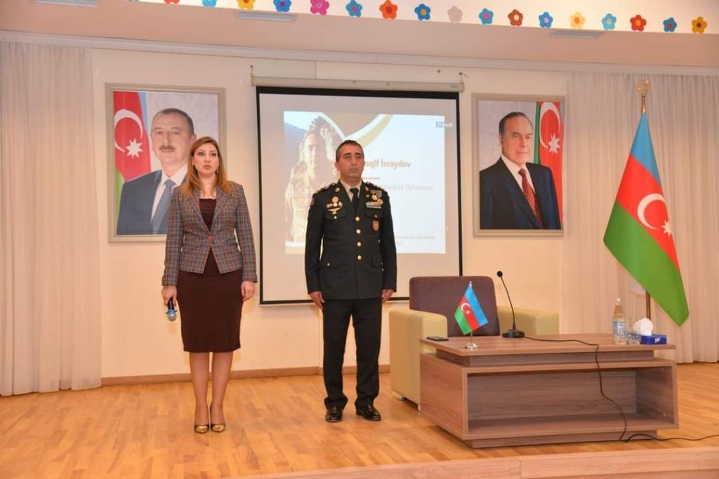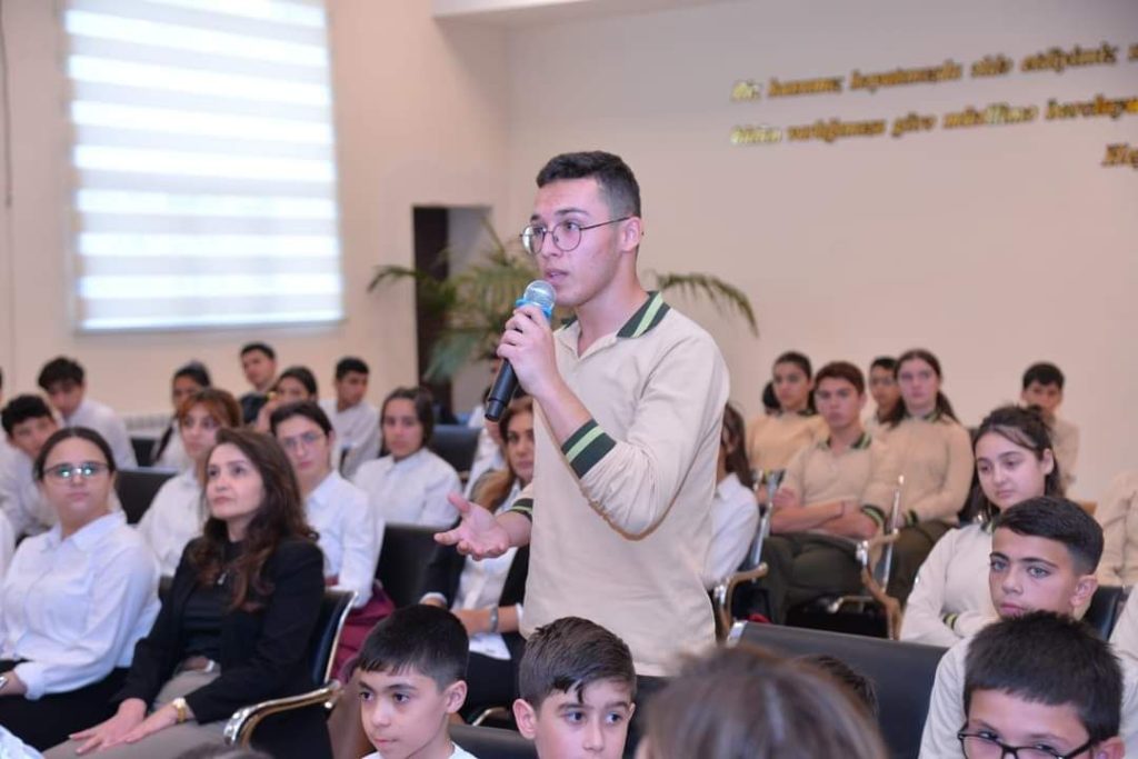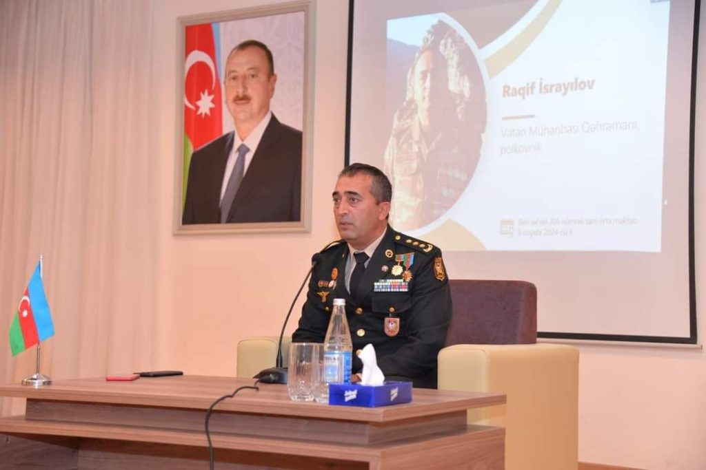 “Vətən qəhrəmanları sinif otaqlarında yetişir”- deyən R.İsrayılov şagirdlərin həqiqi vətənpərvər, əsil vətəndaş olaraq yetişməsində məktəbin, müəllimlərin rolundan, bu məsələdə gənclərin üzərinə düşən vəzifələrdən söz açıb. Qəhrəman hərbçi hər bir azərbaycanlı üçün Zəfərin daşıdığı önəmdən, millət üçün birliyin, həmrəyliyin vacibliyindən danışıb, şagirdləri düşündürən sualları cavablandırıb.Qeyd edək ki, “Məktəbdə…” layihəsinin əsas məqsədi şagirdlərə mənəvi-əxlaqi dəyərlərə hörmət və ictimai məsuliyyət hissi aşılamaq, mütaliəyə marağı artırmaq, vaxtın düzgün idarə olunması, mühitə adaptasiya yollarını təbliğ etməkdən ibarətdir.