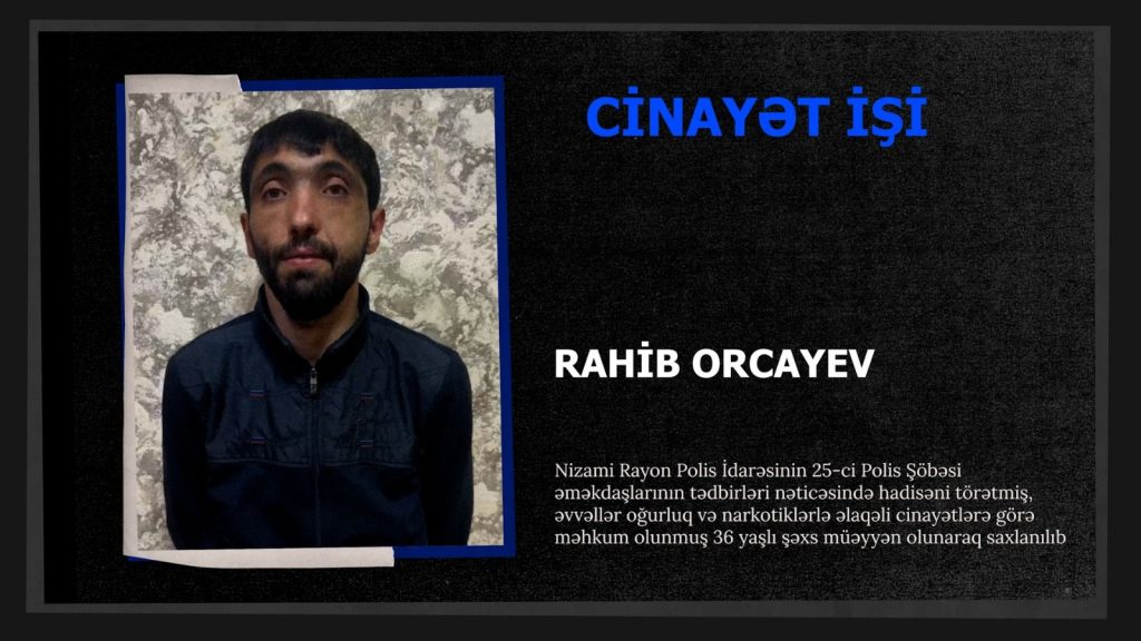 Nizami Rayon Polis İdarəsinin 25-ci Polis Şöbəsi əməkdaşlarının həyata keçirdikləri əməliyyat tədbirləri nəticəsində hadisəni törətmiş, əvvəllər oğurluq və narkotiklərlə əlaqəli cinayətlərə görə məhkum olunmuş 36 yaşlı Rahib Orcayev müəyyən olunaraq saxlanılıb.