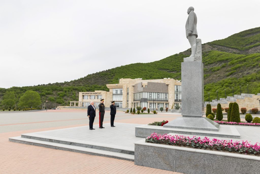 Nazir əvvəlcə Şəki şəhərindəki ümummilli lider Heydər Əliyevin abidəsini ziyarət edərək əziz xatirəsini böyük hörmət və ehtiramla yad edib.