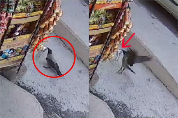 Rəfdən çips torbasını götürüb qaçan qarğa satıcını təəccübləndirdi – VİDEO